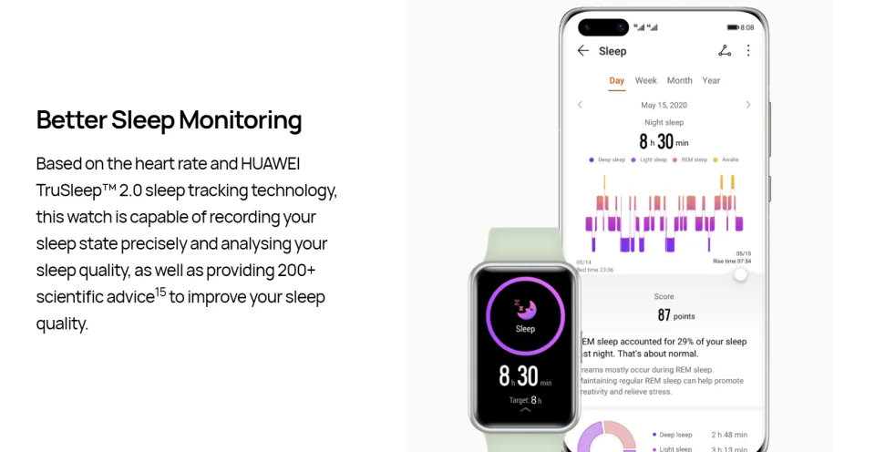 Based on the heart rate and HUAWEI TruSleep™ 2.0 sleep tracking technology, this watch is capable of recording your sleep state precisely and analysing your sleep quality, as well as providing 200+ scientific advice15 to improve your sleep quality.