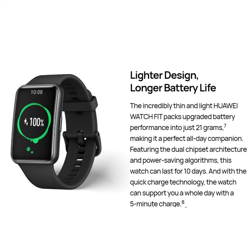 The incredibly thin and light HUAWEI WATCH FIT packs upgraded battery performance into just 21 grams,7 making it a perfect all-day companion. Featuring the dual chipset architecture and power-saving algorithms, this watch can last for 10 days. And with the quick charge technology, the watch can support you a whole day with a 5-minute charge.8